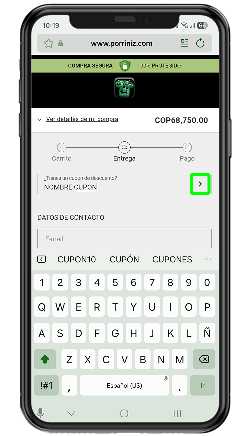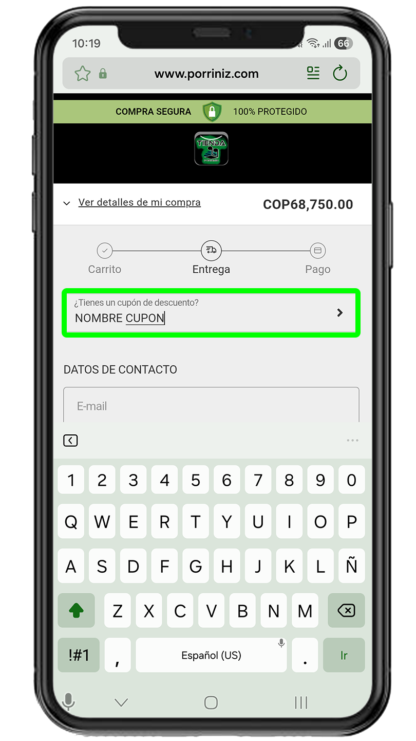 Ahora ayudándote del teclado escribe el nombre del cupón de descuento que te haya indicado nuestro sistema de Tienda Porriniz.